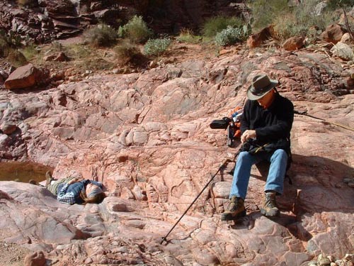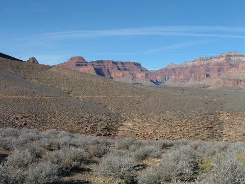 We left Indian Gardens and picked up the Tonto Trail. This trail crosses the plateau and meets up with the South Kaibab Trail which will take us to the bottom and our home for the next several days.